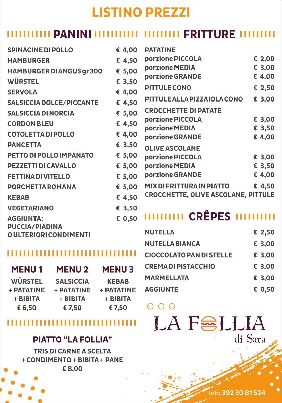 Da La Follia vogliamo offrire un’esperienza culinaria unica, capace di soddisfare ogni palato, grazie a un menù ricco e variegato. I nostri panini sono preparati con ingredienti freschi e genuini, per un gusto esplosivo ad ogni morso. Se sei amante del kebab, troverai da noi carne saporita e ben speziata, servita in piadine calde o panini fragranti. Per chi invece desidera un tocco di dolcezza, le nostre crepes sono un vero e proprio peccato di gola, disponibili in tantissime varianti per accontentare tutti i gusti. E se vuoi concederti uno sfizio croccante e irresistibile, la nostra friggitoria è il posto giusto per te!